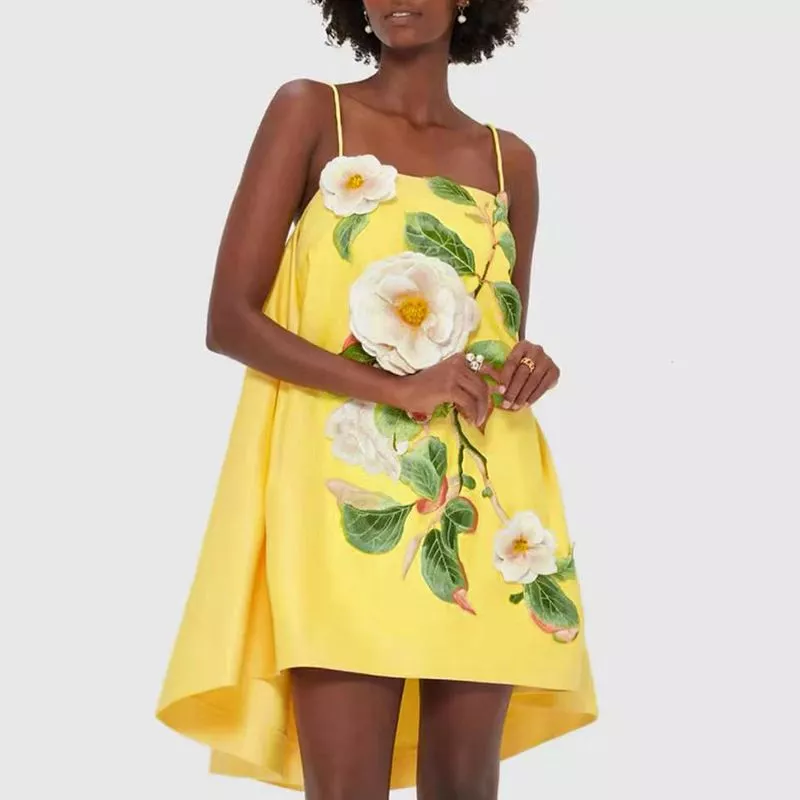 Abito Colorato Elegante Con Fiori Ricamati E Spalline Sottili Chic CF54899