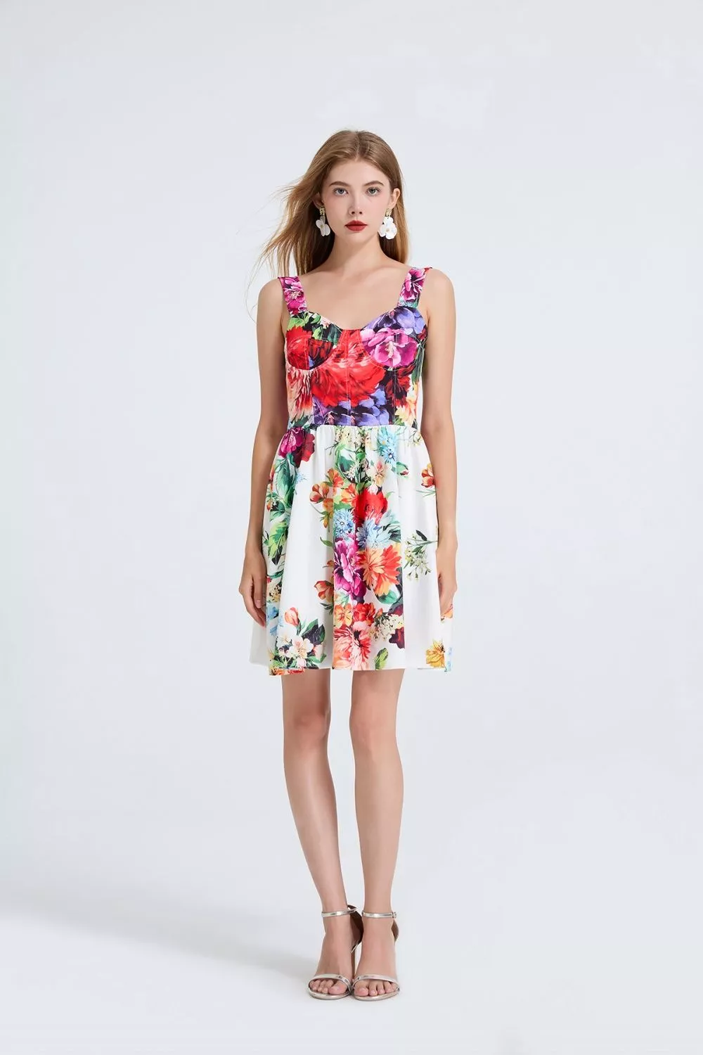 Vestito Corto Floreale A Vita Alta Con Elastico Posteriore Elegante CF55046