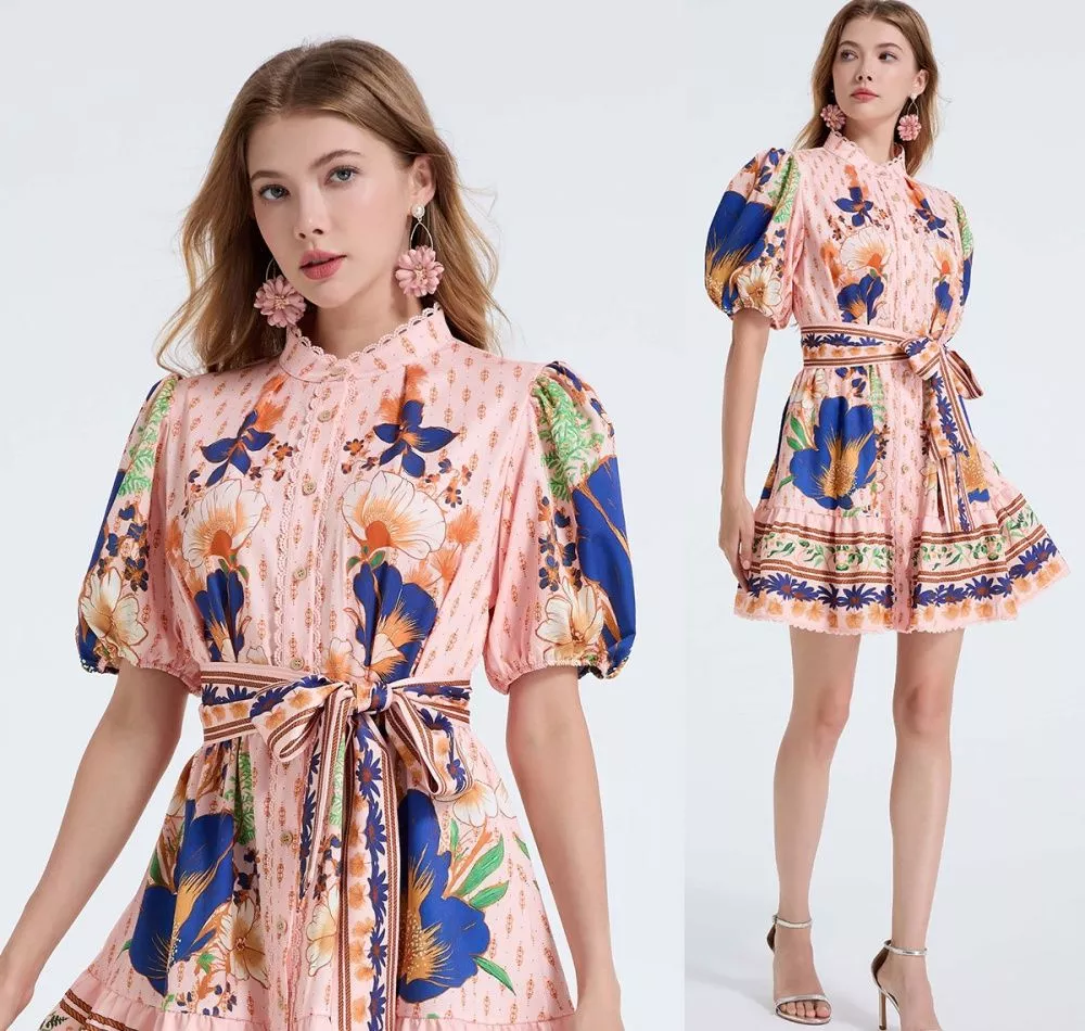 Vestito Rosa Con Cintura E Maniche A Sbuffo Stile Elegante Floreale CF55694