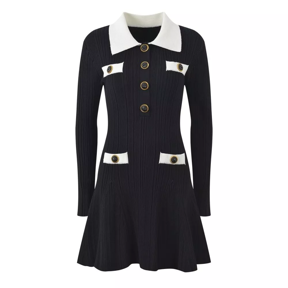 Vestito A Maglia A Coste Colletto A Contrasto E Bottoni Decorativi Nero CF61442