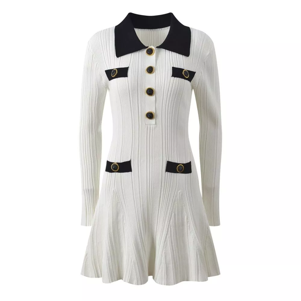 Vestito A Maglia A Coste Con Colletto A Contrasto E Bottoni Bianco CF61442