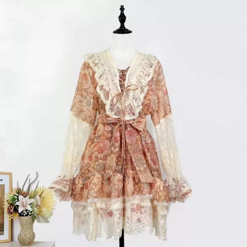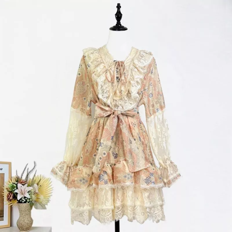Mini Vestito Donna Floreale Albicocca Con Pizzo E Balze Vita Regolabile CF65733