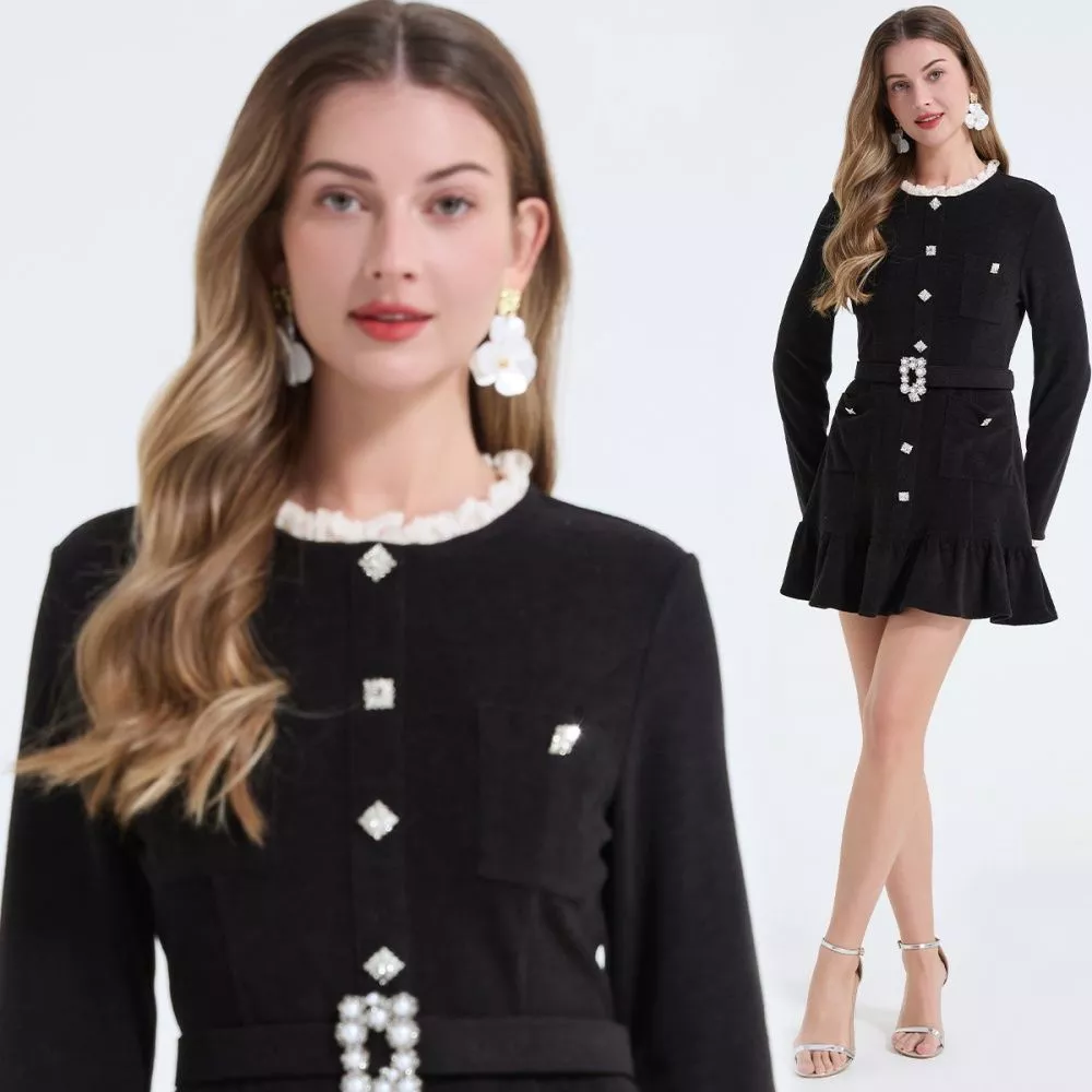Mini Vestito Donna Nero Elegante Con Bottoni Gioiello E Cintura In Vita CF65814