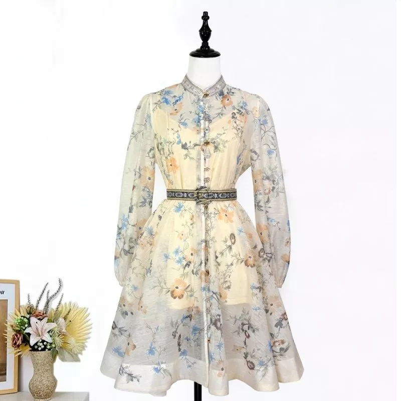 Vestito Donna Elegante Albicocca Floreale Con Cintura Maniche Lunghe CF66875