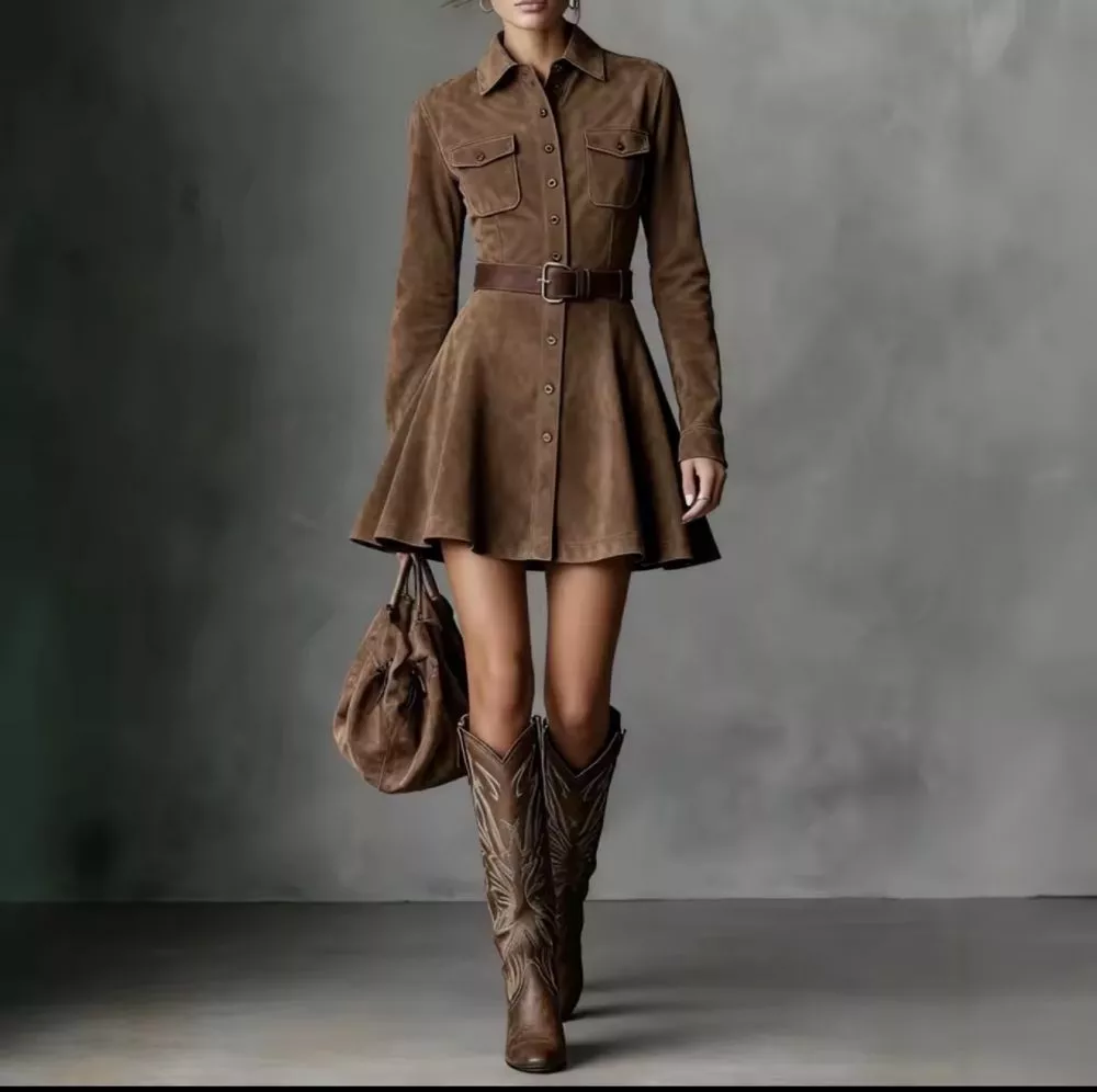 Abito Corto Marrone Effetto Pelle Scamosciata Stile Camicia Maniche Lunghe 67429