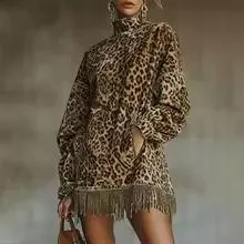 Mini Abito Donna Leopardato Con Frange Elegante Linea Aderente CF27491