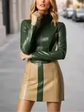Abito Donna In Pelle Sintetica Verde E Beige Con Zip Frontale Aderente CF73492