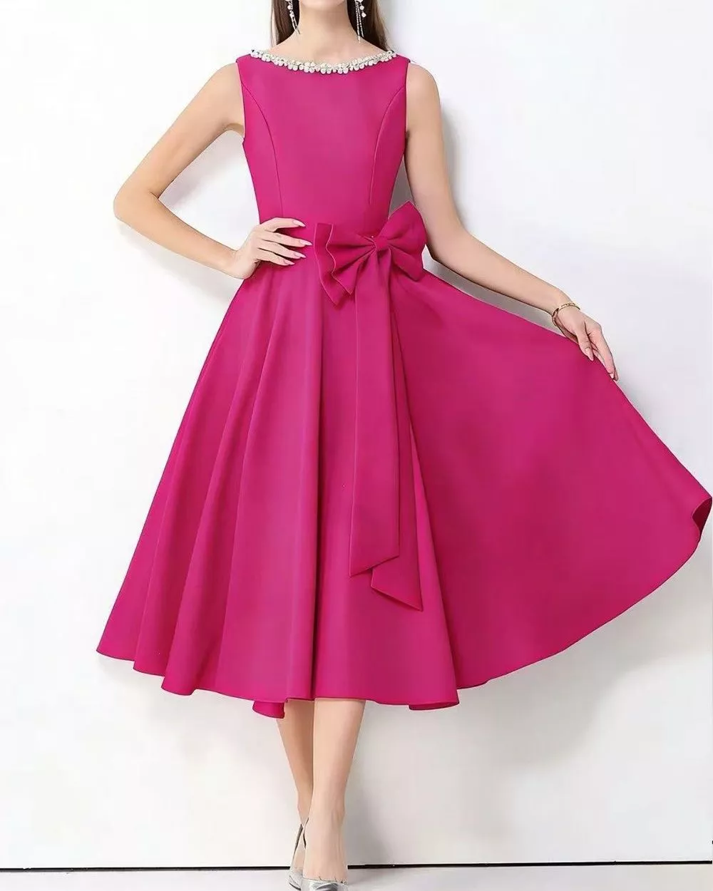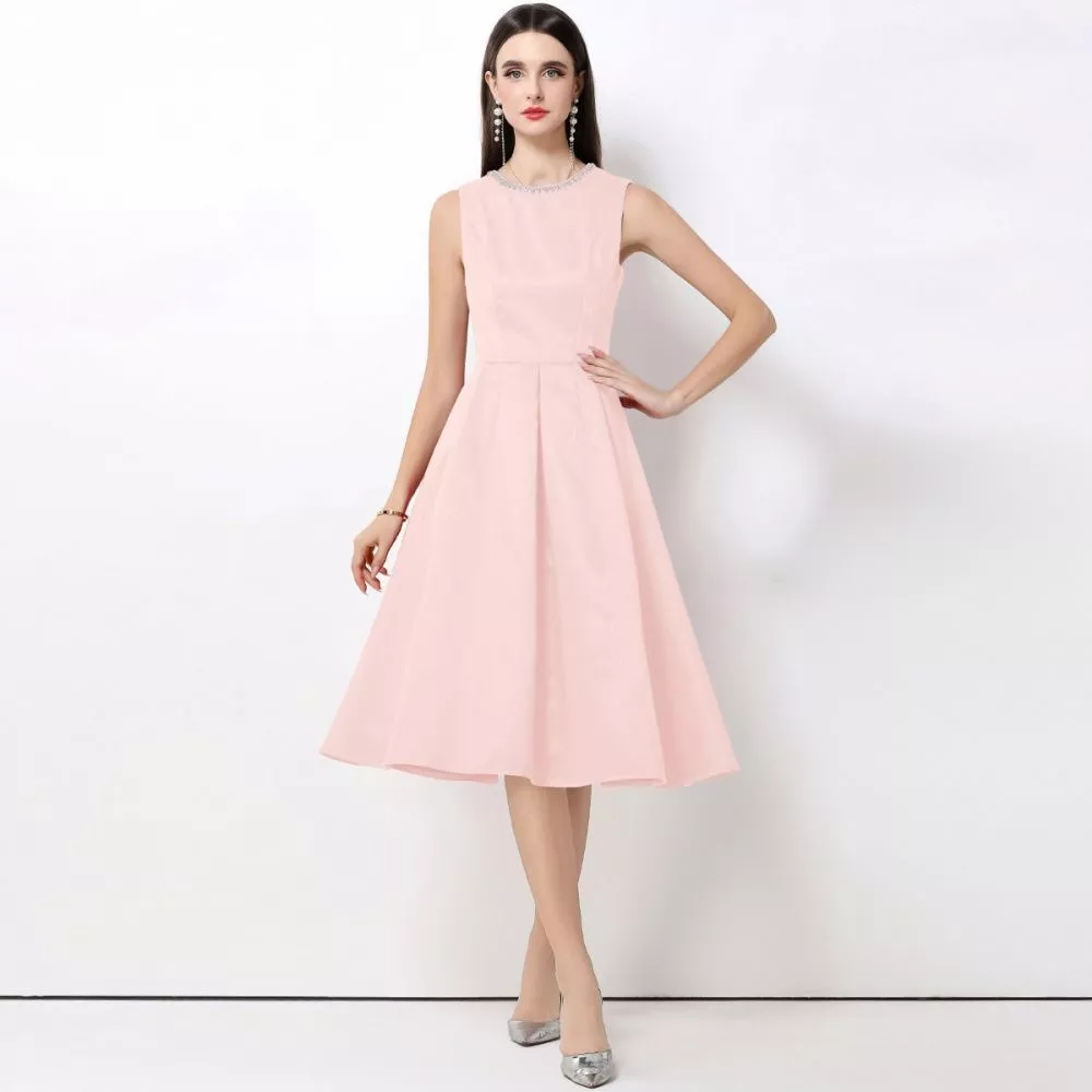 Vestito Elegante Senza Maniche Con Vita Definita E Dettaglio Strass Rosa CF65931