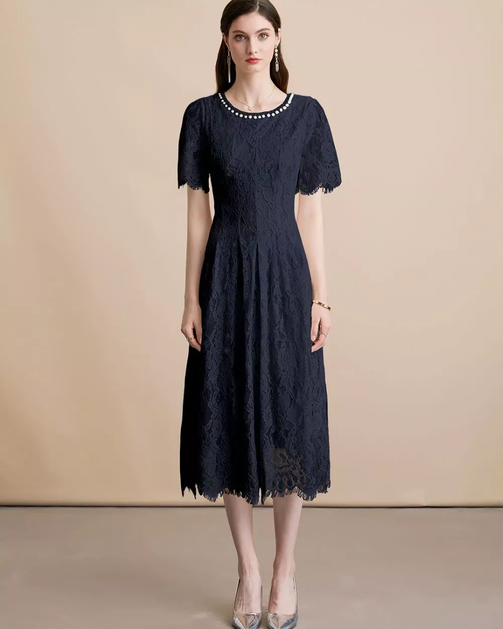 Vestito Nero Elegante In Pizzo Con Girocollo Di Perle E Taglio Svasato CF54096