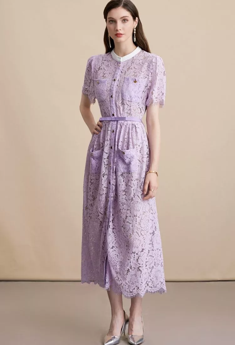 Vestito Porpora Elegante In Pizzo Con Maniche Corte E Cintura In Vita CF54180