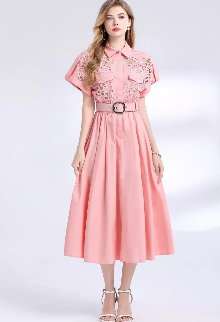 Vestito Rosa Midi Elegante In Pizzo Con Camicia E Cintura In Vita CF54191