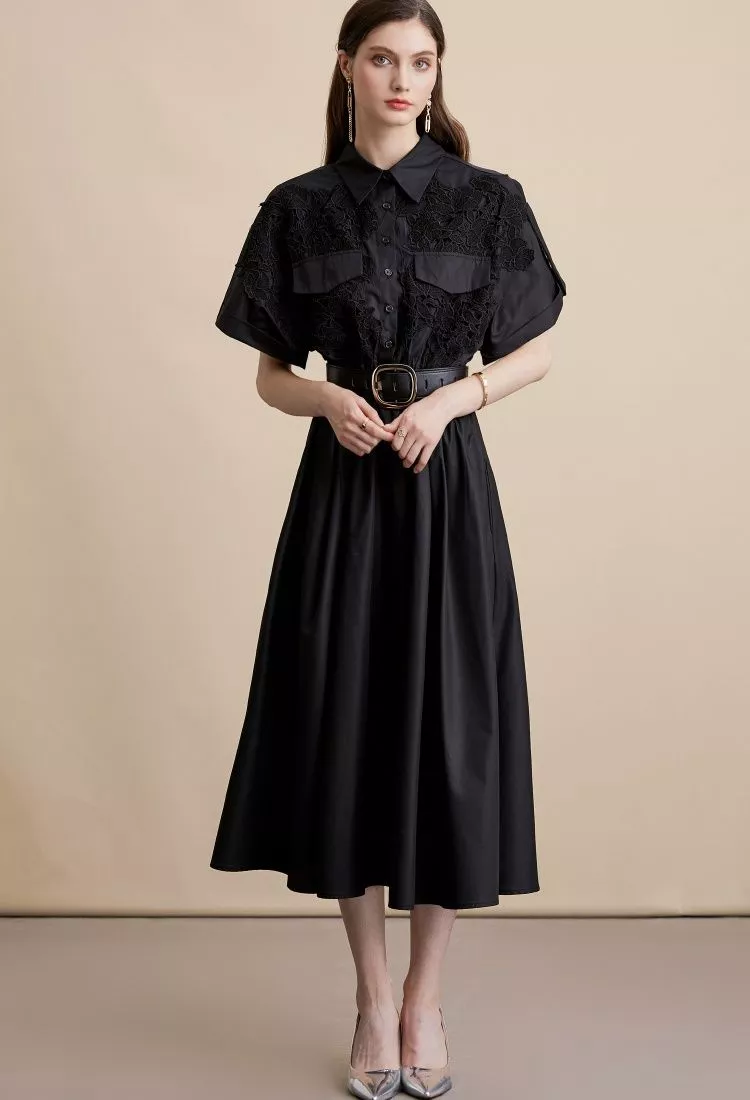 Vestito Nero Midi Elegante In Pizzo Con Camicia E Cintura In Vita CF54192