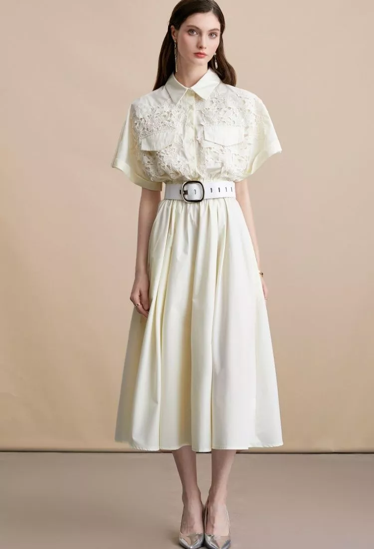 Vestito Midi Elegante Albicocca In Pizzo Con Camicia E Cintura In Vita CF54193