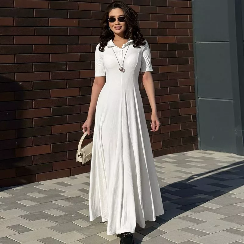 Vestito Bianco Lungo Donna Elegante Con Colletto Camicia Maniche Corte CF54424