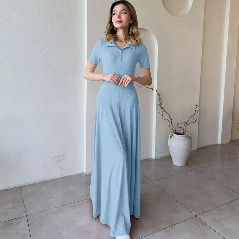 Vestito Azzurro Lungo Donna Elegante Con Colletto Camicia Stile Estivo CF54424