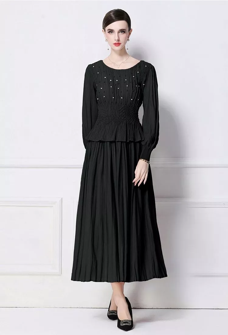 Vestito Elegante Plissé Con Perline Manica Lunga Nero Cerimonia Midi CF58963