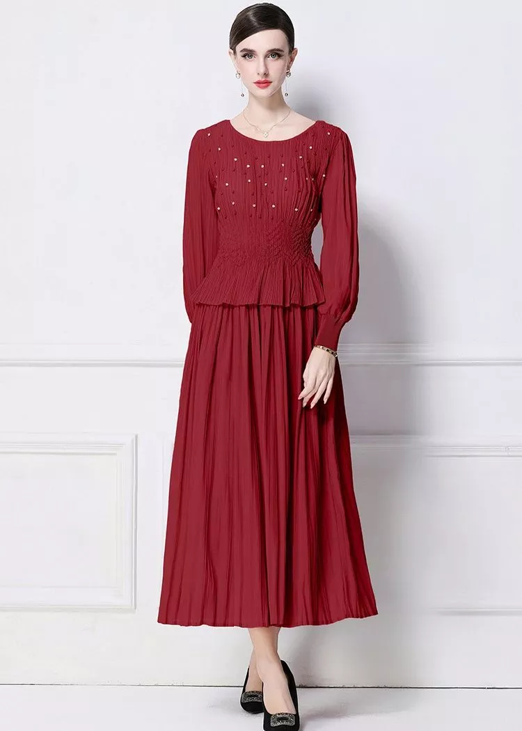 Vestito Plissé Con Perline Rosso Vino Elegante Cerimonia Sera Midi CF58963