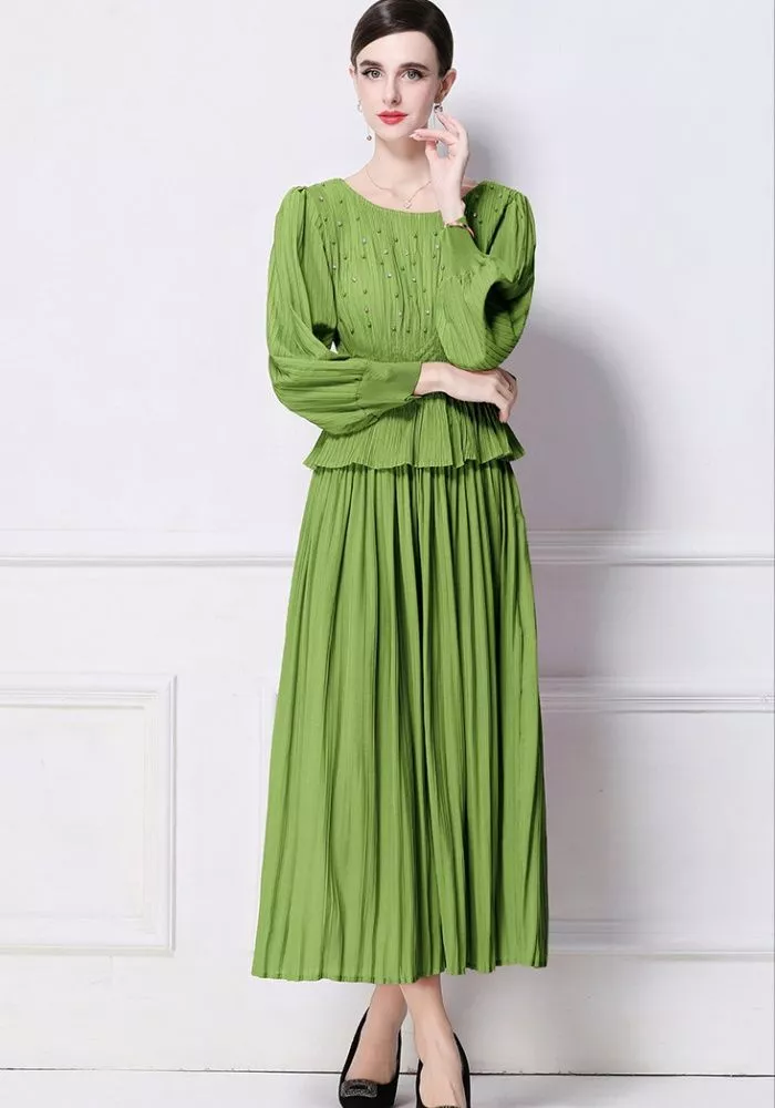 Abito Plissé Con Perline Verde Smeraldo Elegante Cerimonia Raffinato CF58963