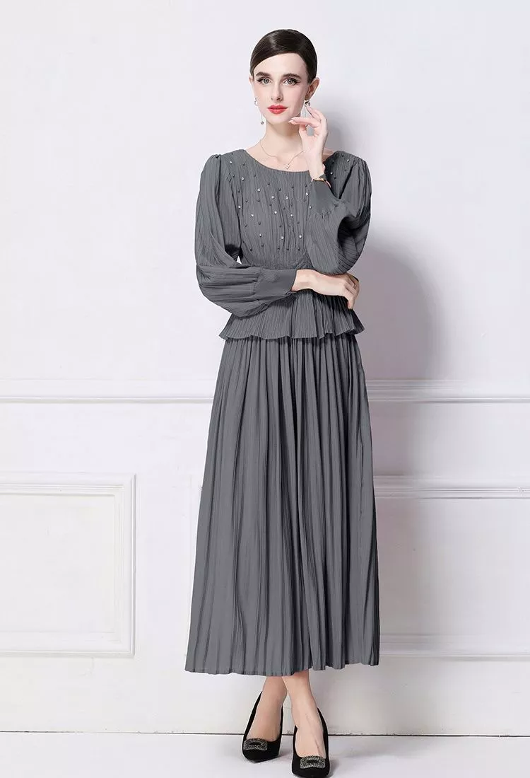 Abito Plissé Con Perline Manica Lunga Grigio Elegante Per Eventi Midi CF58963