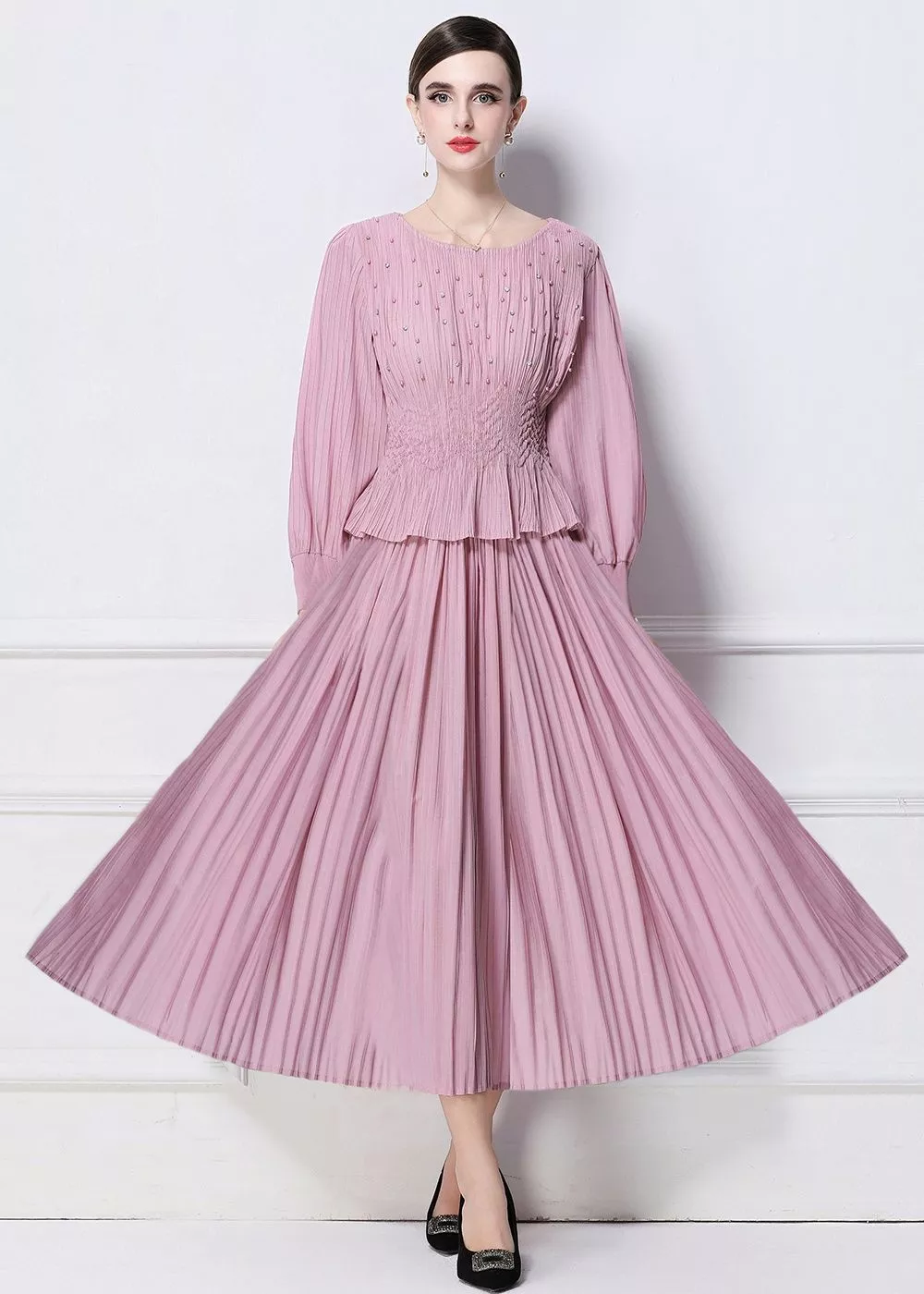 Vestito Plissé Perline Rosa Cipria Elegante Cerimonia Stile Romantico CF58963