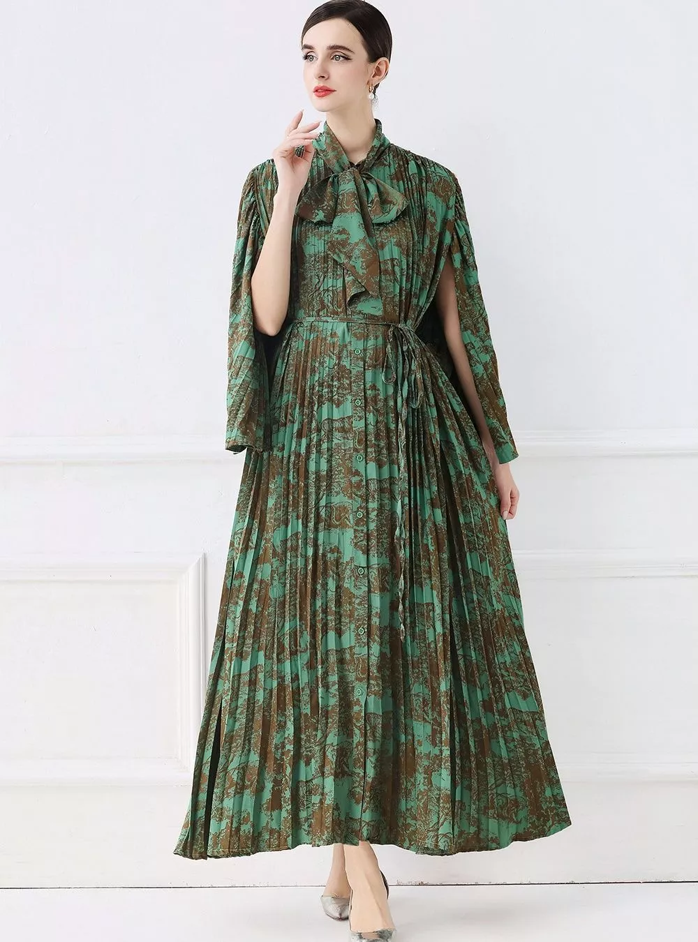 Vestito Lungo Plissé Fantasia Verde Mantella Elegante Cerimonia Donna CF58966