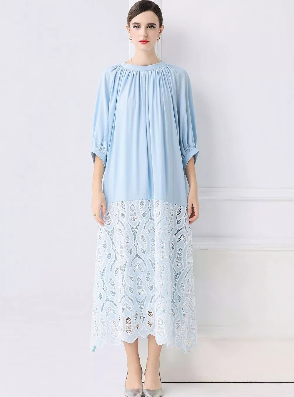 Vestito Lungo Celeste Pizzo Ricamato Elegante Cerimonia Donna Stile Soft CF58967