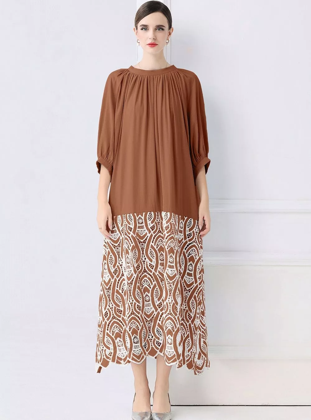 Vestito Lungo Marrone Con Pizzo Ricamato Elegante Cerimonia Donna Chic CF58967