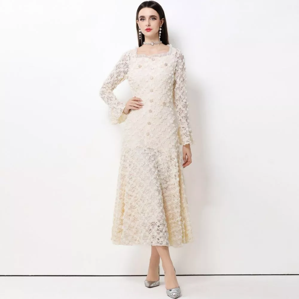 Vestito Lungo Donna Bianco In Pizzo Fiori Ricamati E Maniche Trasparenti CF62025