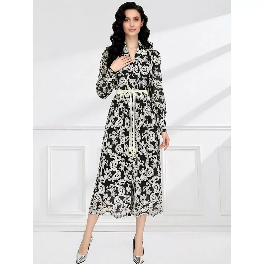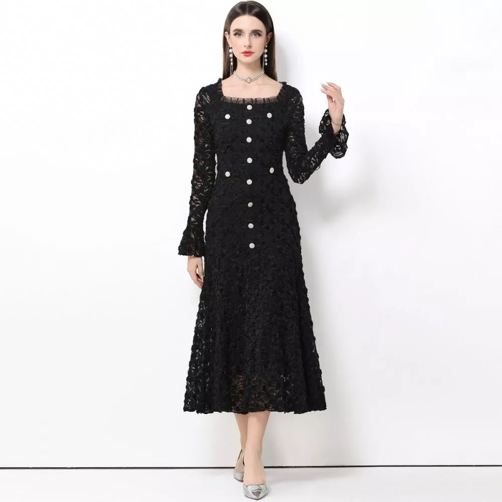 Vestito Midi Donna Nero In Pizzo Maniche Lunghe Silhouette Elegante CF61770