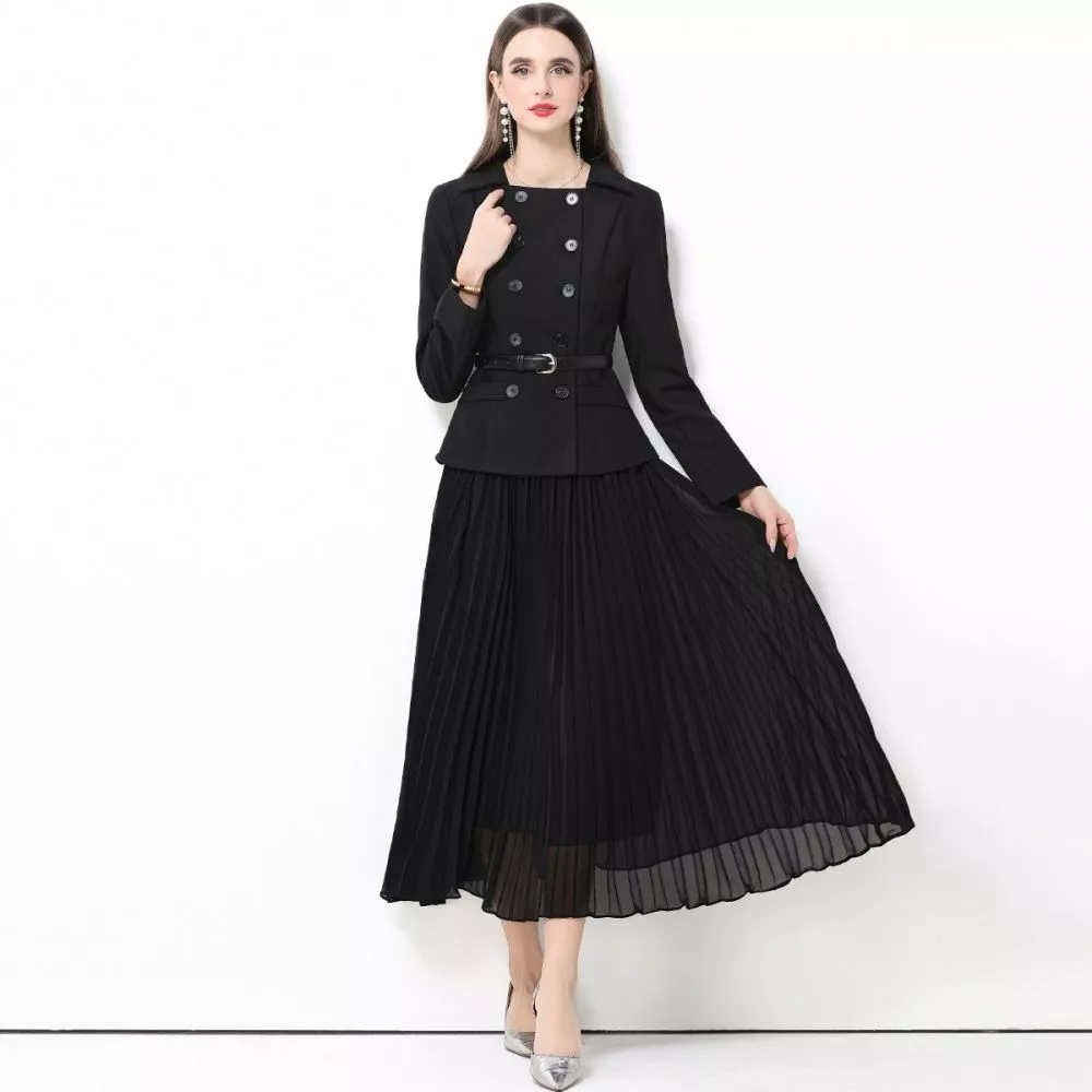 Vestito Midi Donna Nero Con Gonna Plissettata Maniche Lunghe CF61775