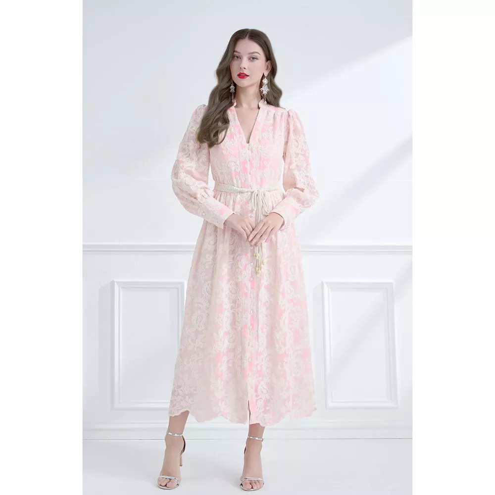 Vestito Midi Donna In Pizzo Rosa Cipria Elegante Scollo Maniche Lunghe CF61786