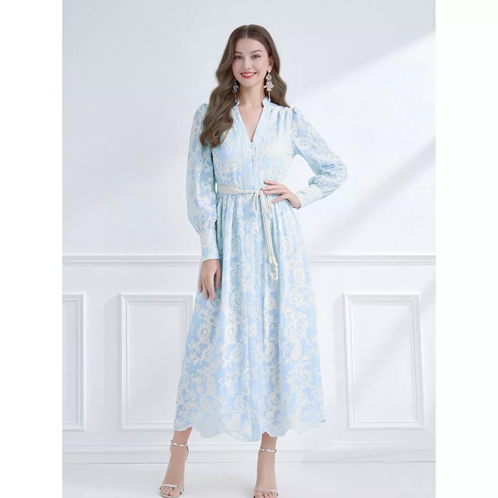 Vestito Midi Donna In Pizzo Azzurro Polvere Scollo A V Maniche Lunghe CF61787