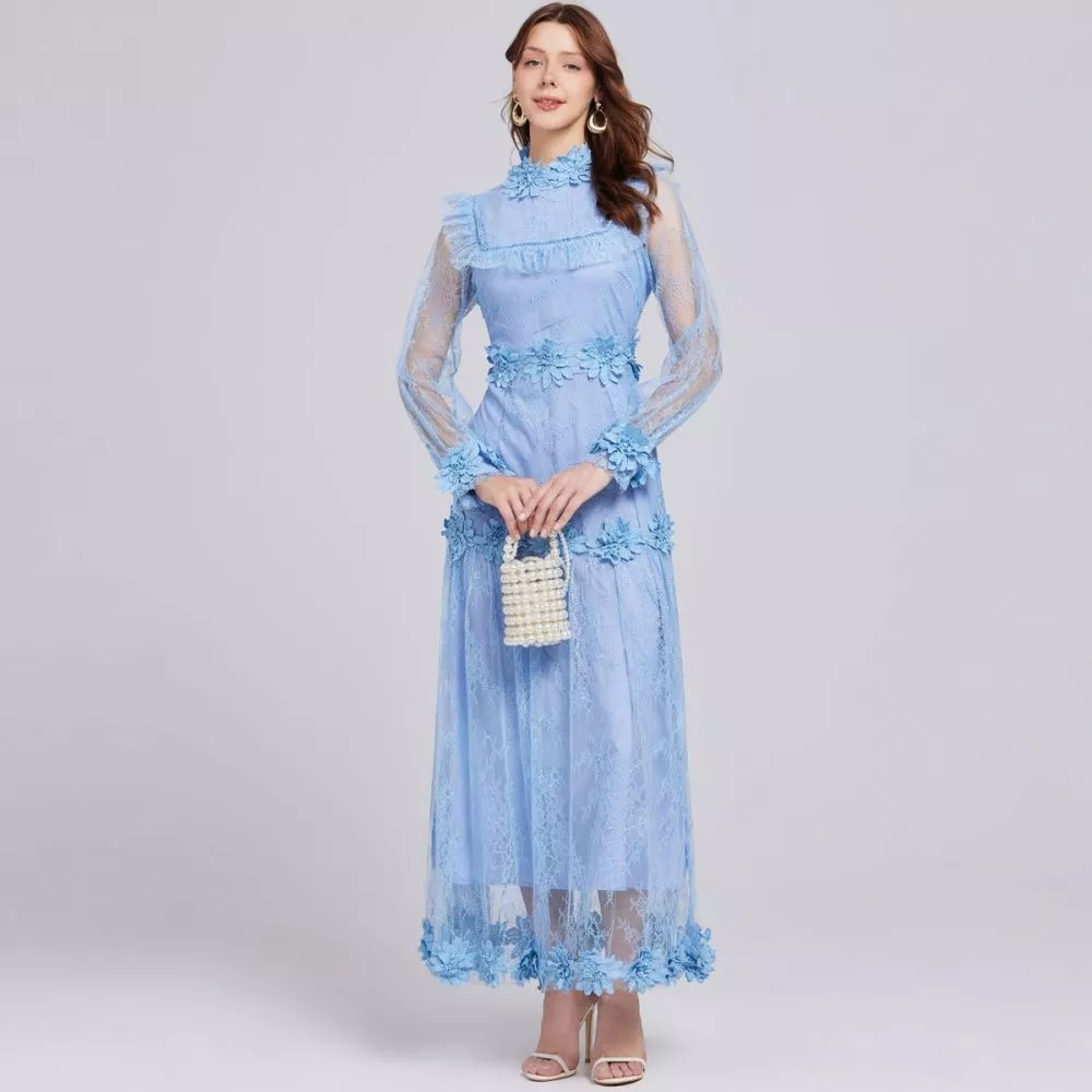 Abito Lungo Donna Azzurro In Pizzo Con Ricami Floreali E Maniche Lunghe CF62025