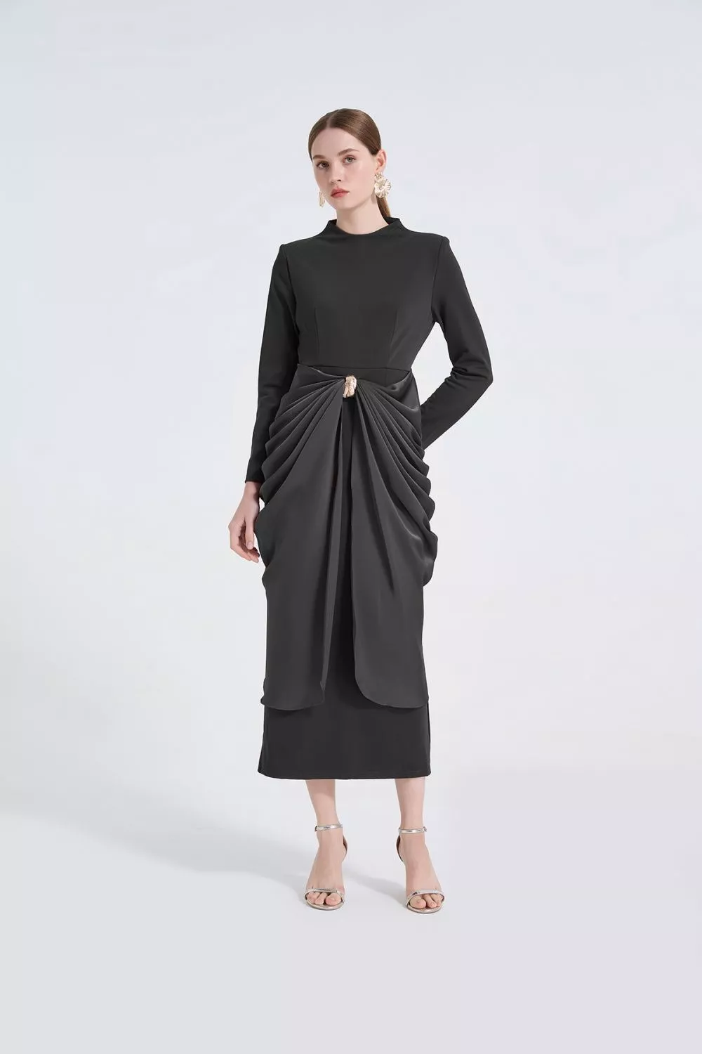Vestito Donna Nero Elegante Aderente Con Drappeggio E Maniche Lunghe CF62600
