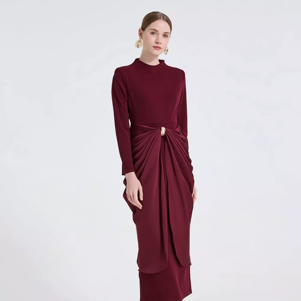 Vestito Donna Rosso Vino Elegante Aderente Con Drappeggio Maniche Lunghe CF62600