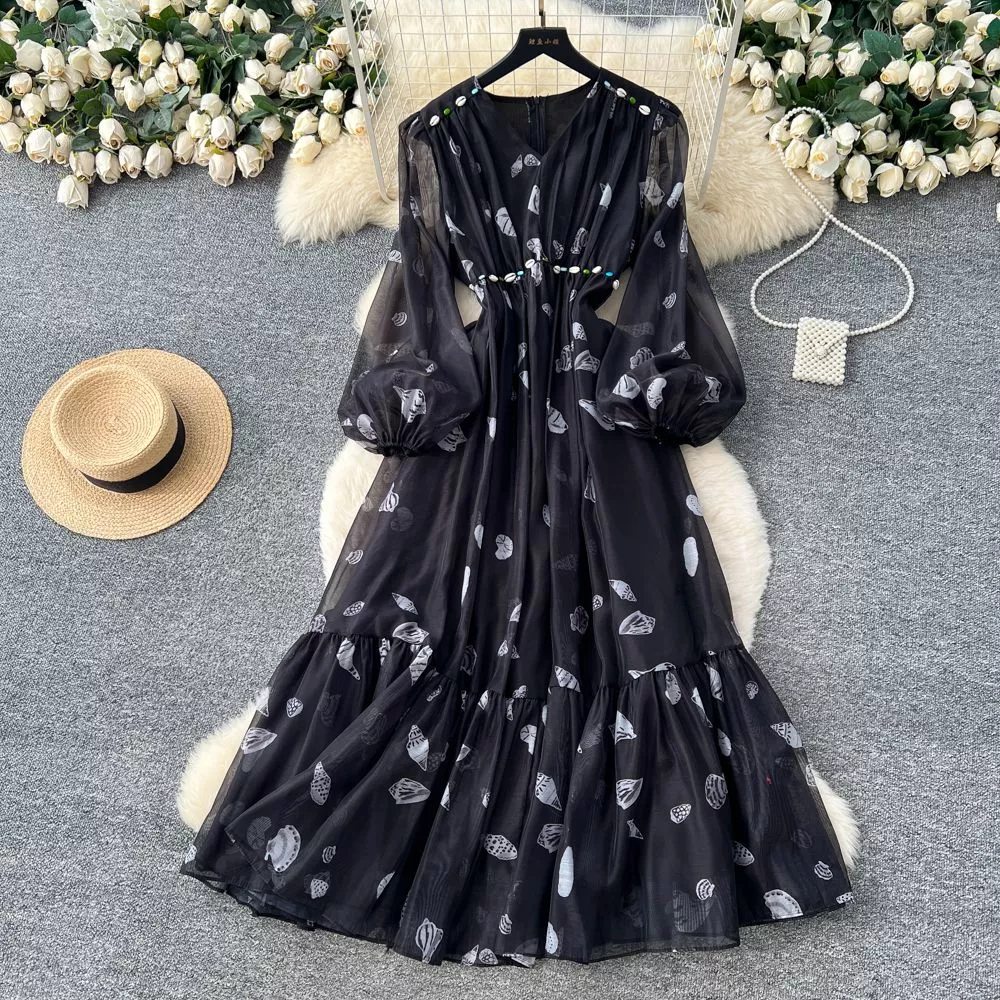 Vestito Donna Nero Lungo Fantasia Floreale Con Maniche A Palloncino CF62844