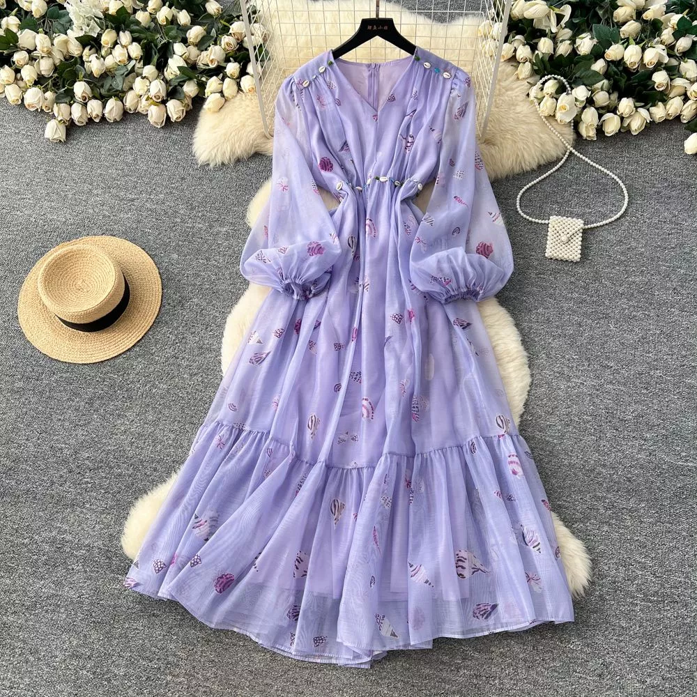 Vestito Donna Viola Chiaro Lungo Fantasia Floreale Maniche A Palloncino CF62844