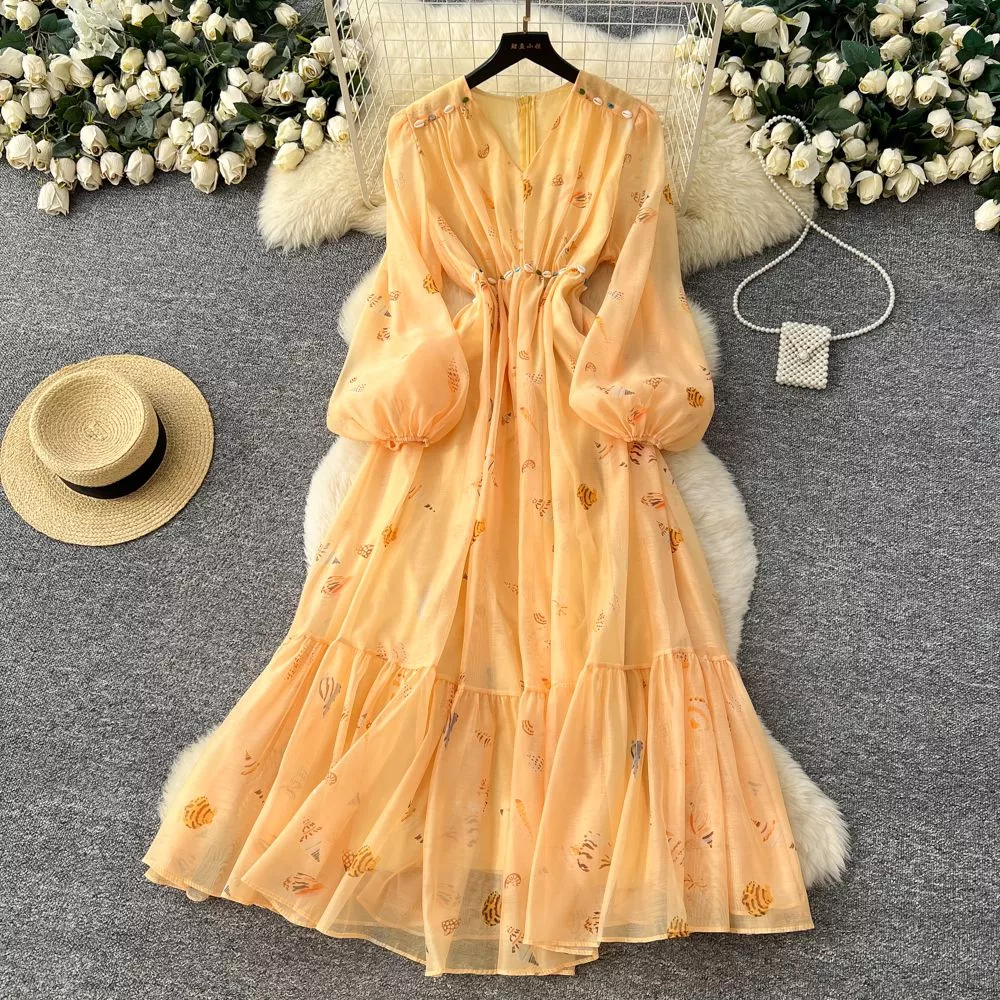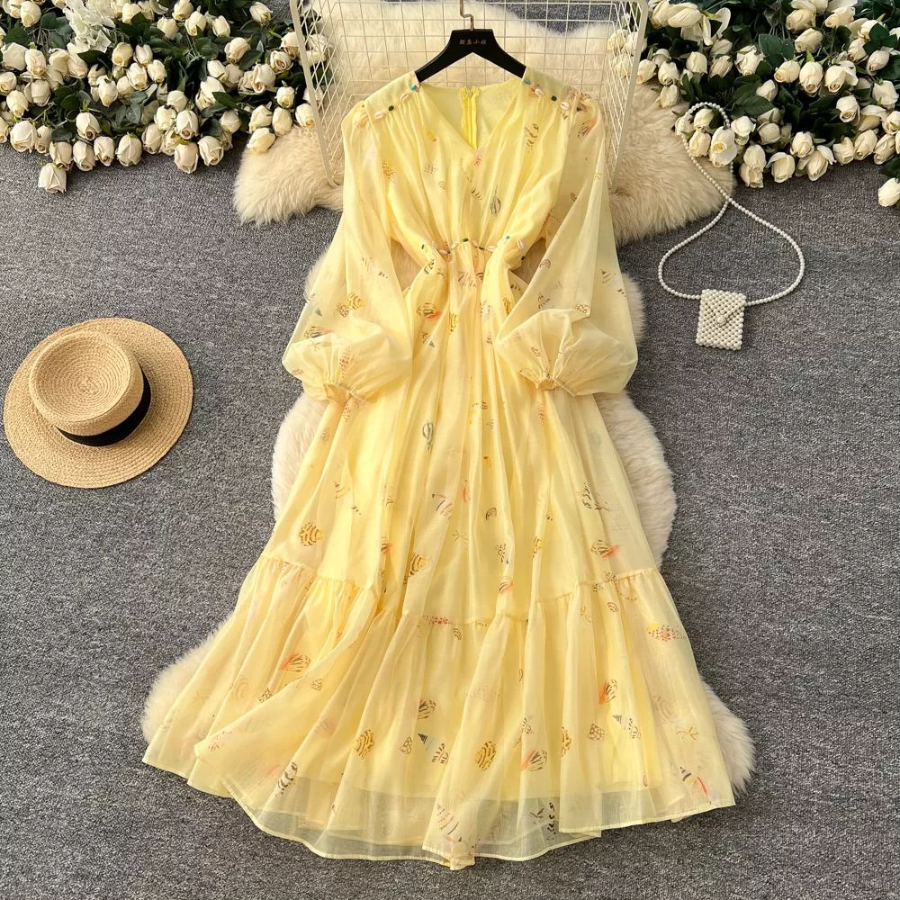 Vestito Donna Giallo Lungo Fantasia Floreale Con Maniche A Palloncino CF62844