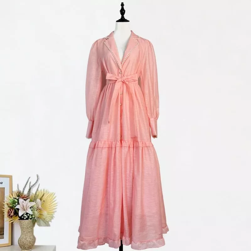 Vestito Lungo Rosa Cipria Elegante Con Scollo A V E Cintura In Vita CF63383