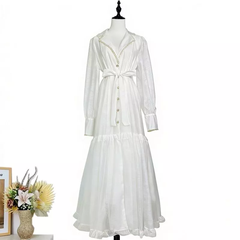 Vestito Lungo Bianco Raffinato Con Scollo A V E Cintura In Vita CF63383