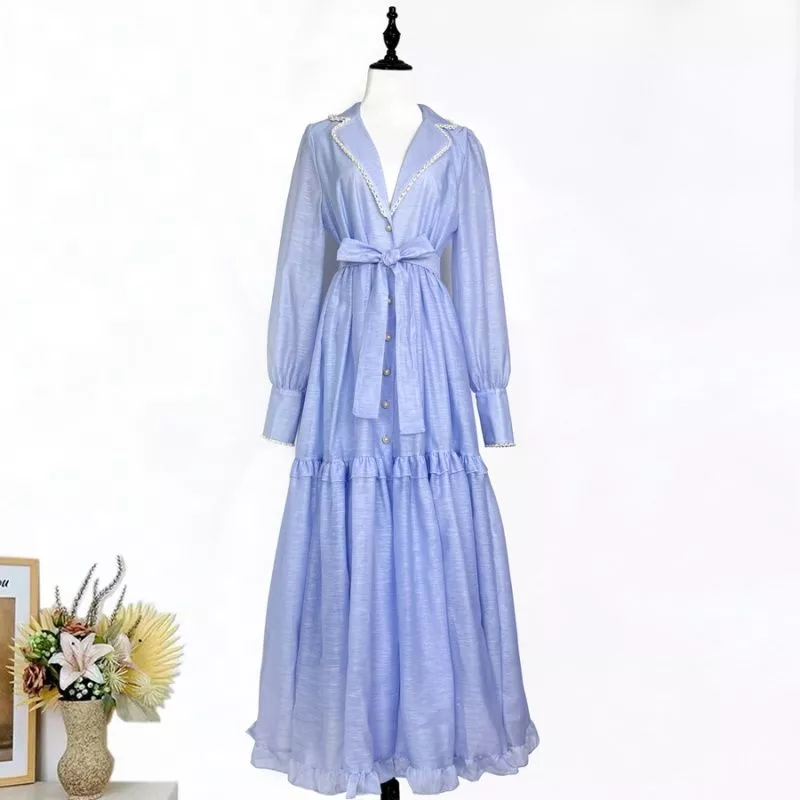 Vestito Lungo Blu Polvere Elegante Con Scollo A V E Cintura In Vita CF63383
