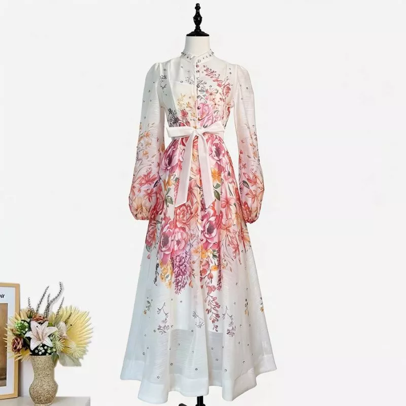 Vestito Lungo Bianco Floreale Con Maniche Lunghe E Cintura In Vita CF63386