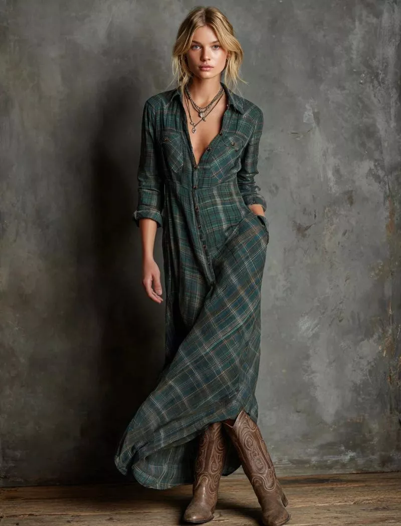 Vestito Lungo Donna A Quadri Scacchi Chemisier Bottoni E Maniche Lunghe CF63485