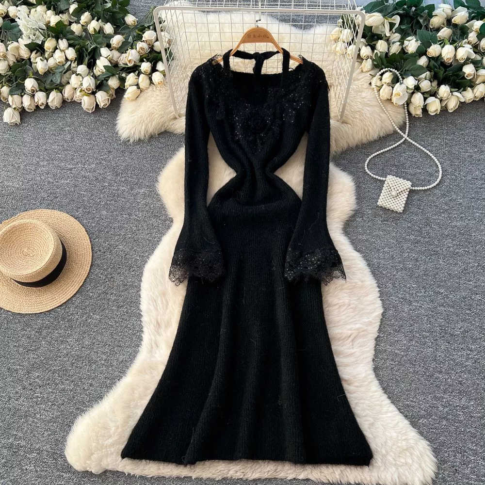 Vestito Donna Nero In Maglia Con Pizzo Floreale E Vita Sagomata Elegante CF63958