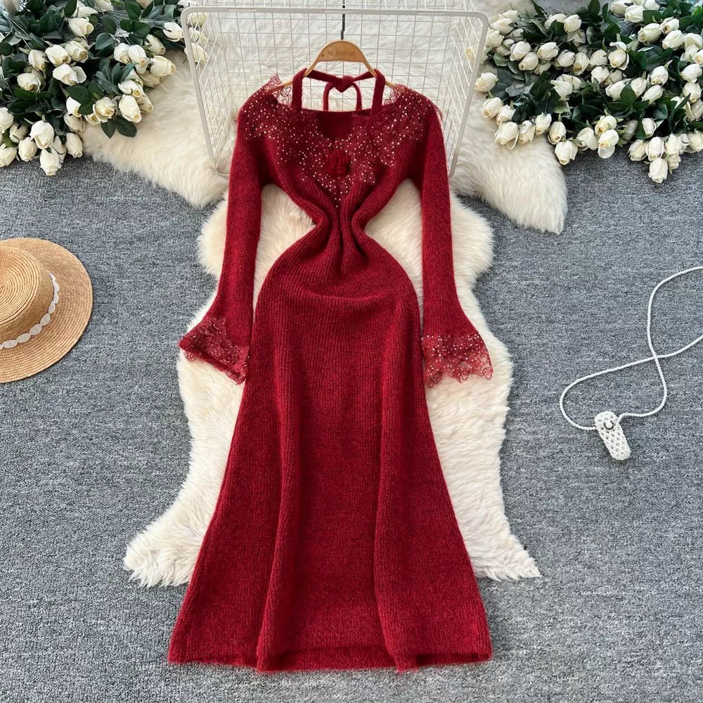 Vestito Donna Rosso In Maglia Pizzo Floreale E Vita Sagomata Raffinata CF63958