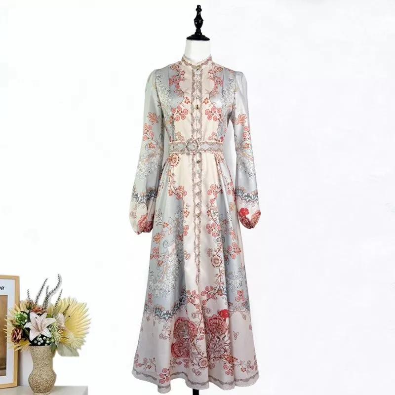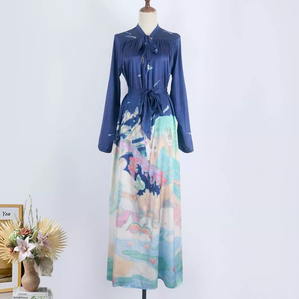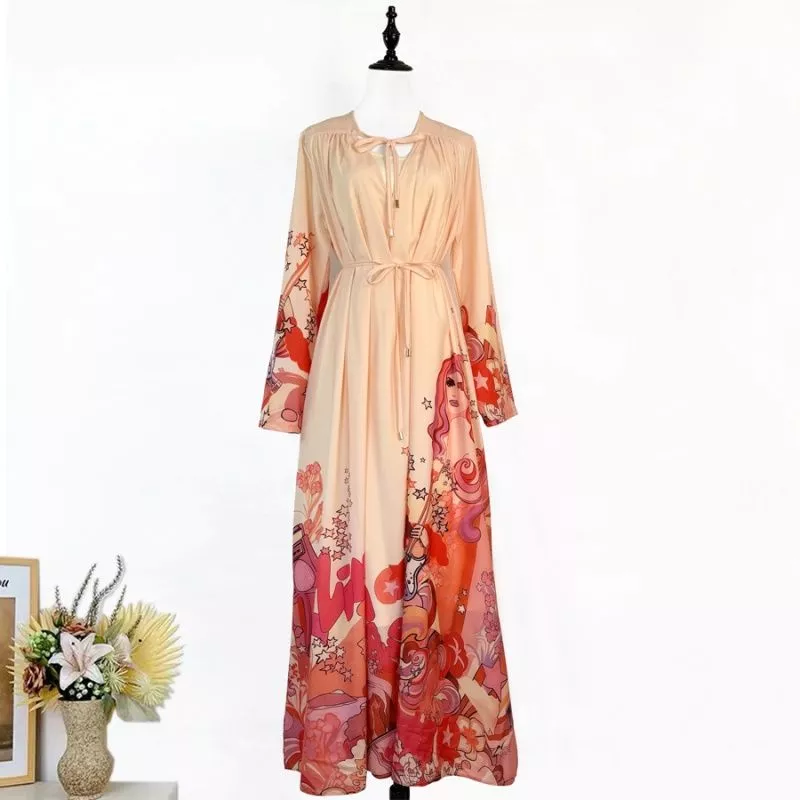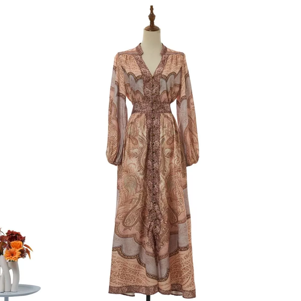 Abito Lungo Donna Elegante Con Scollo A V E Stampa Decorativa A Maniche CF64579