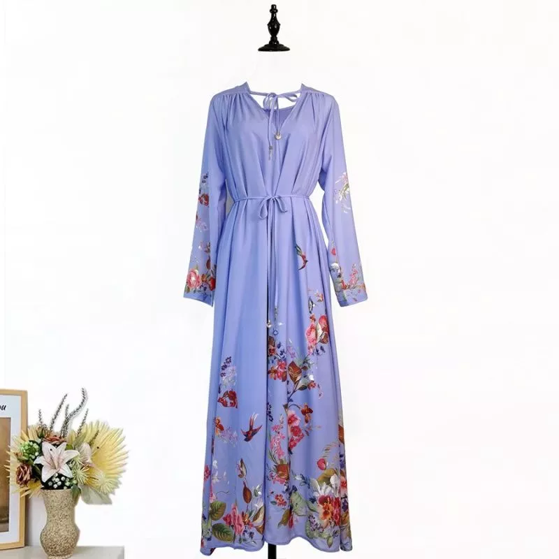 Vestito Donna Lungo Viola Fantasia Floreale Stile Boho Maniche Lunghe CF64736
