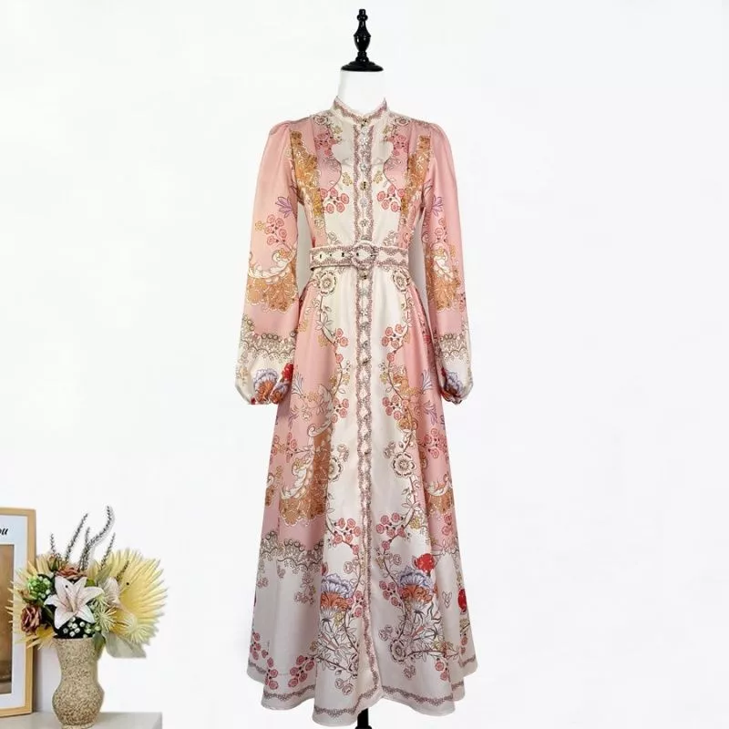 Vestito Donna Lungo Rosa Fantasia Floreale Stile Boho Con Maniche Lunghe CF64736