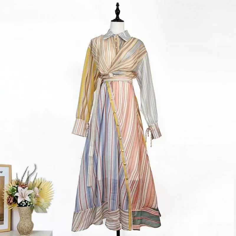 Vestito Donna Lungo Multicolore A Righe Maniche Lunghe Linea Elegante CF64740