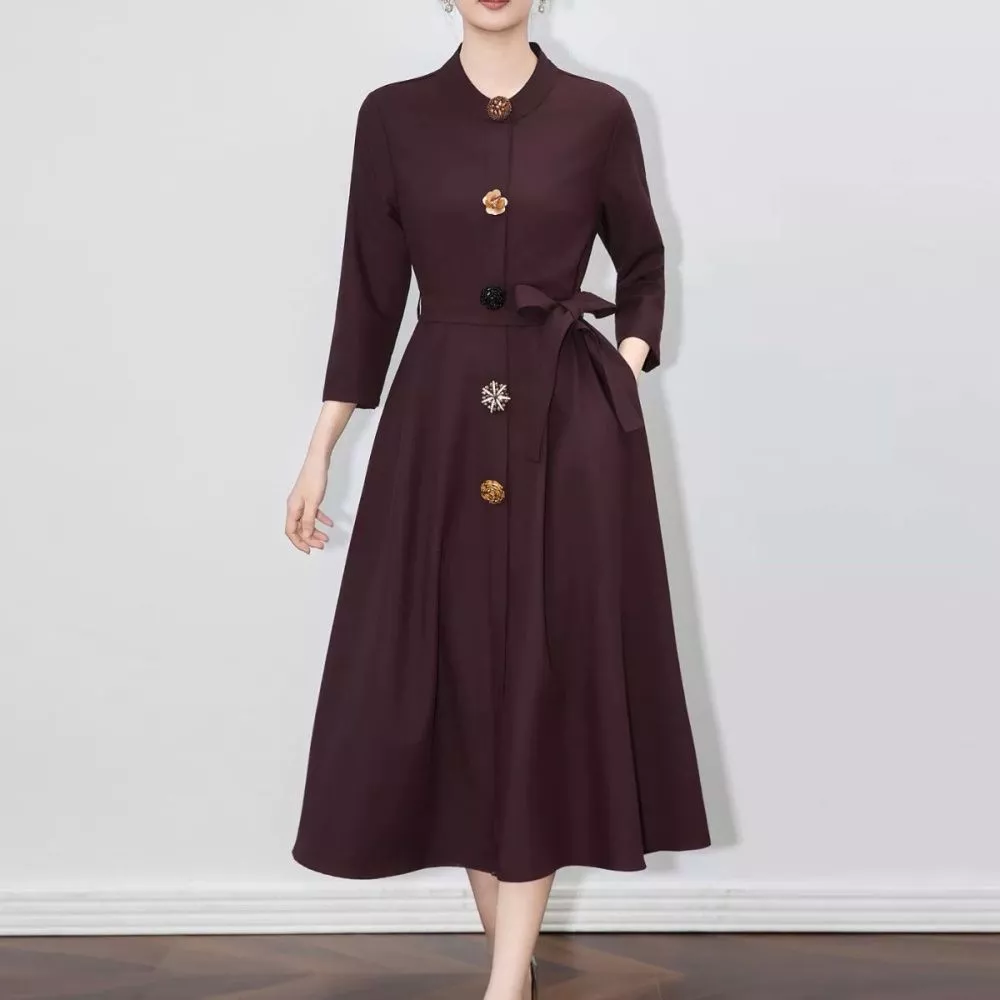 Vestito Lungo Elegante Con Girocollo Gonna Ampia Vita Con Cintura Viola CF66016